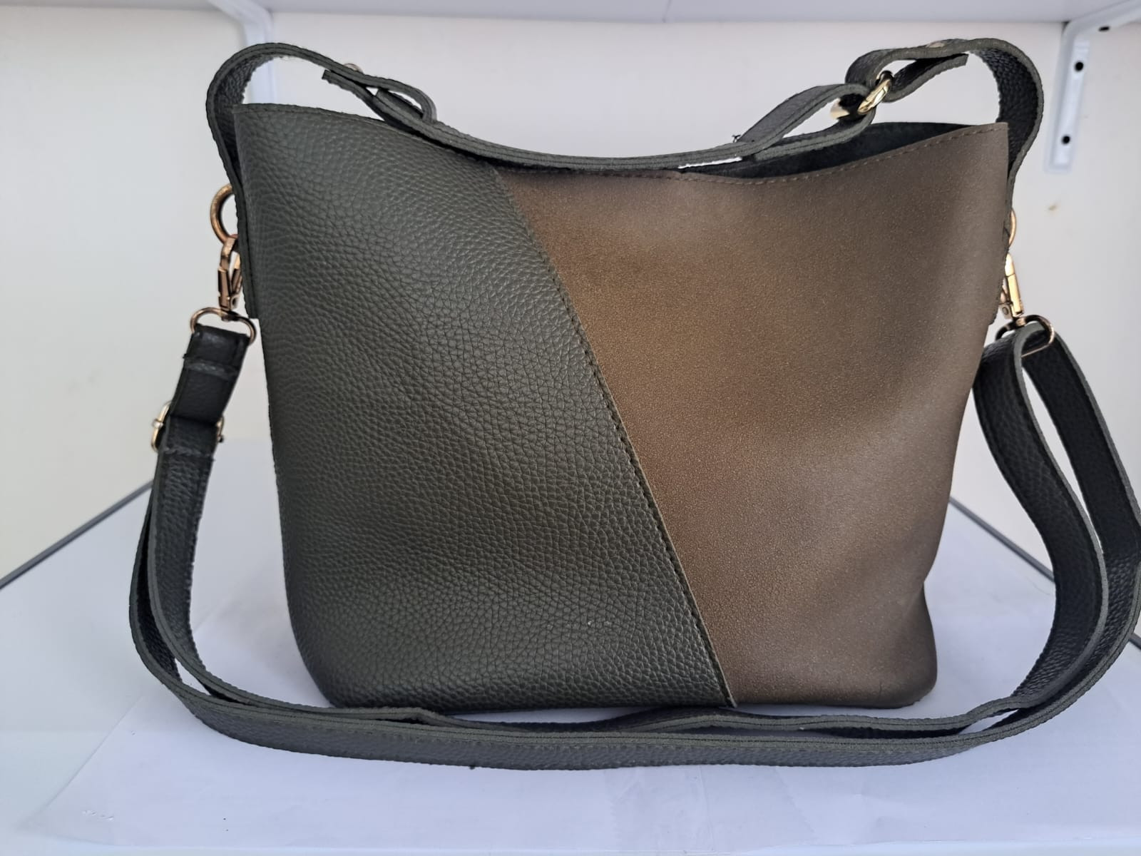 Bahan kulas, talpan bawaan. Warna mix hijau abu. 1 kompartemen dengan kancing penutup. PA 30cm, PB 24cm, T 22cm