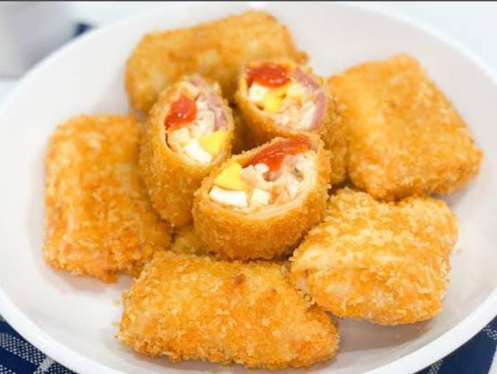 snack risol yang berisi potongan daging asap, potongan telur, dan saos mayonaise. Harga satuan @5.000