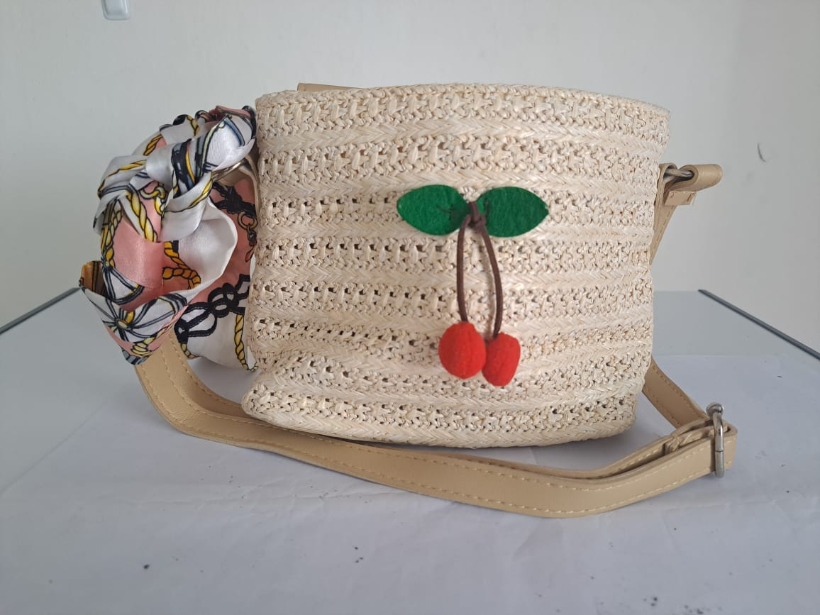 Bahan rajut, ada talpan. Variasi pita dan hiasan cherry. Warna cream, 1 kompartemen. PA 20cm, PB 18cm, T 15cm